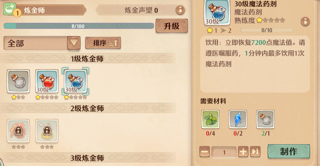 炼金师的话则需要炼制药品来获取经验,低等级时可能仅需制作几十瓶血瓶和魔瓶即可拉满经验条,但到了高等级时则需要制作流程更加繁琐的炸药,除草剂和营养剂这些东西。