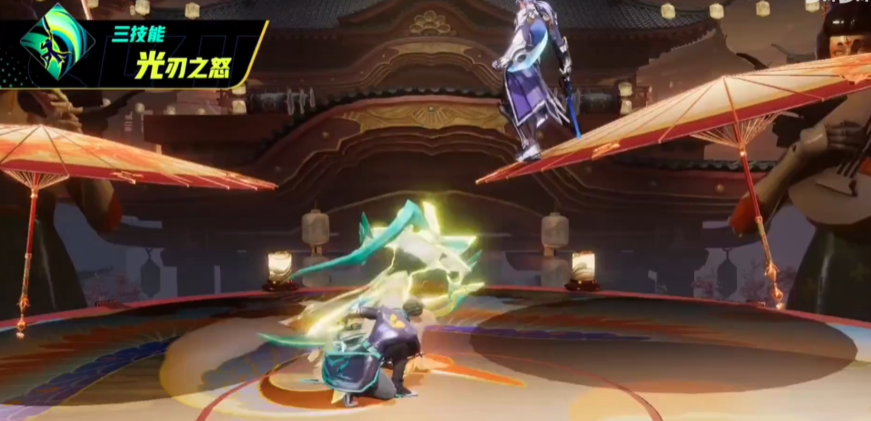二技能:极刃风暴。向前发动两次斩击,而第一次斩击可以打断敌人的动作,而第二次进攻则可以造成额外伤增伤。而且如果他身边有飞刃,那么这次额外斩击将会使飞刃锁定敌人并追击,将敌人打到空中,并且增加自身的移速。如果铠在空中使用二技能,那么第二次斩击会变成一个下落重击,对敌人造成更高的伤害和击退效果。这个技能是铠的主要输出和控制技能,它可以让铠进行位移和击飞,打乱敌人的节奏和防御。如果身边有留存的飞刃则会第二次斩击会更加强力,可以将敌人打到高处,然后进行后续的连招。这个技能在空中释放还会加强斩杀效果,所以要注意抓住机会使用。