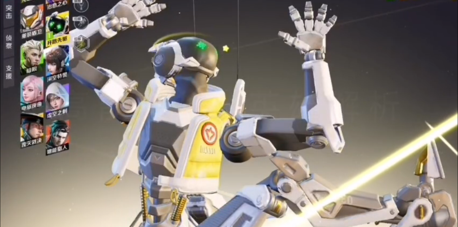 接下来玩家介绍的是空空,空空这个英雄最大的特点是机动性和位移能力特别强,它的外形酷似一个机器人,空空可以使用钩爪进行高速位移,他的武器为冲锋枪,伤害能力特别高,可以轻松击杀敌方脆皮C位。空空属于典型的突进收割型选手,拥有强大的机动性和攻击能力,但是他的操作难度比较高,对新手玩家来说是一个十分大的挑战。