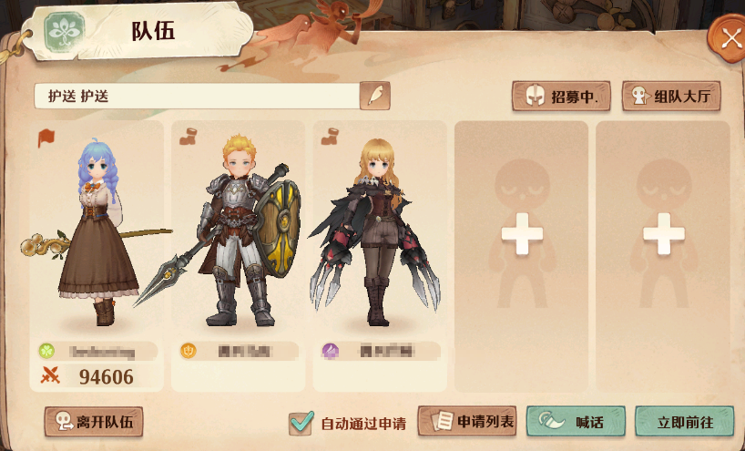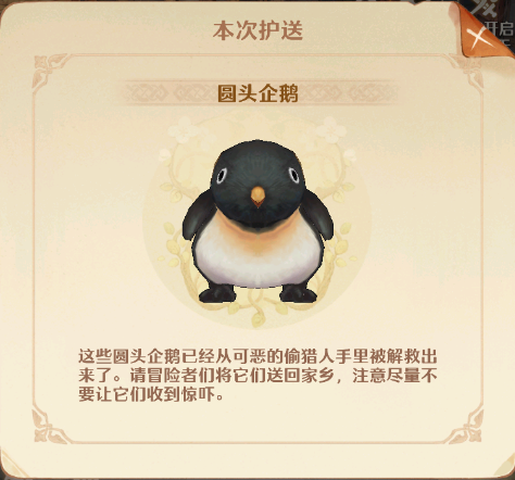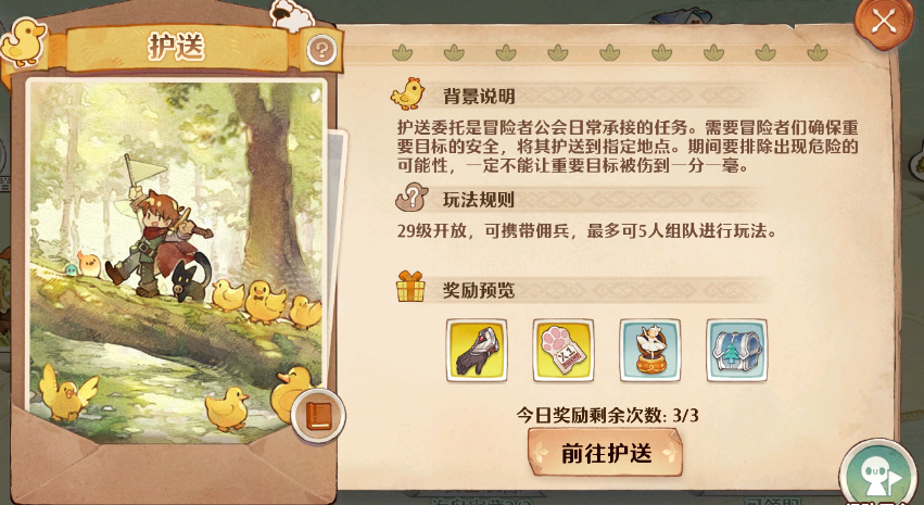 需要注意的是,玩家们接到的任务是护送各种小动物前往目的地。小动物行动较慢,所以勇者们在护送期间也会降低移速,避免它们掉队。在到达目标区域前,会在野外碰到各式各样的拦路的敌人,打败它们,保护小动物吧!每天可以领取6轮护送奖励,其中前3轮的奖励更为丰厚。第3轮还可以得到魔力八音盒奖励哦!