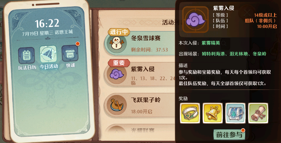 除了比较固定的玩法之外,游戏中增加了限时玩法,让玩家们在游戏中可以有更好的体验,限时活动目前是有4个的,分别是【东泉雪球赛】,【紫雾入侵】,【飞跃果子林】,【光耀联赛】,这几个是游戏中比较特殊的本,玩家们最好是都参与进来,因为掉落的奖励还是比较丰富的。