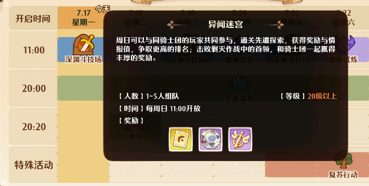 第三个玩法是周天中午11点才会开启的【异闻迷宫】,玩家们可以在周日的时候与骑士团的玩家一起参与,通关先遣探索,然后以获得的奖励和情报来争取名次,玩家们等级需要20级以上就可以选择1到5人进行组队了。主要是消灭掉作战中的首领就可以了!