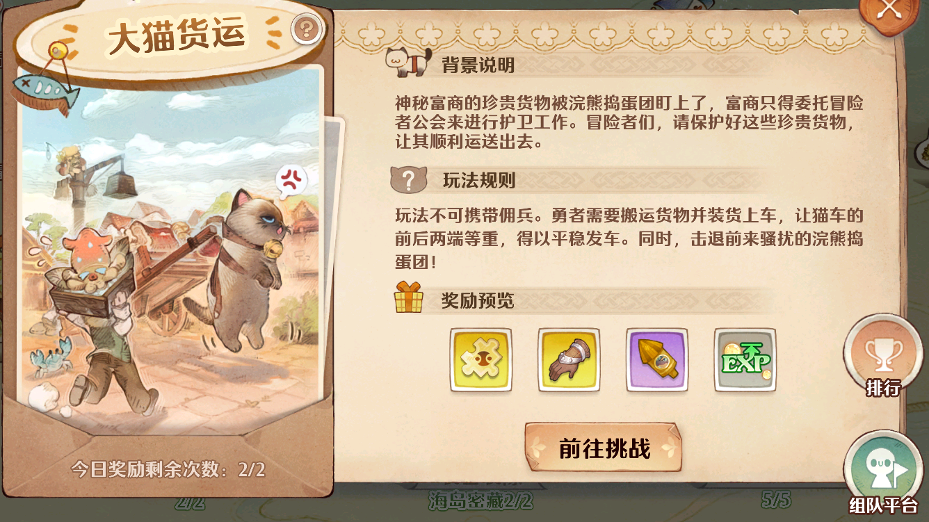 为了确保收益最大化,所以建议在挑战之前先组队,组队即可以增强队伍的整体实力,而且最终结算的奖励也是会有额外加成的,所以一定要先找到几个志同道合的好友,毕竟一会儿还需要它们帮忙搬运和护卫。
