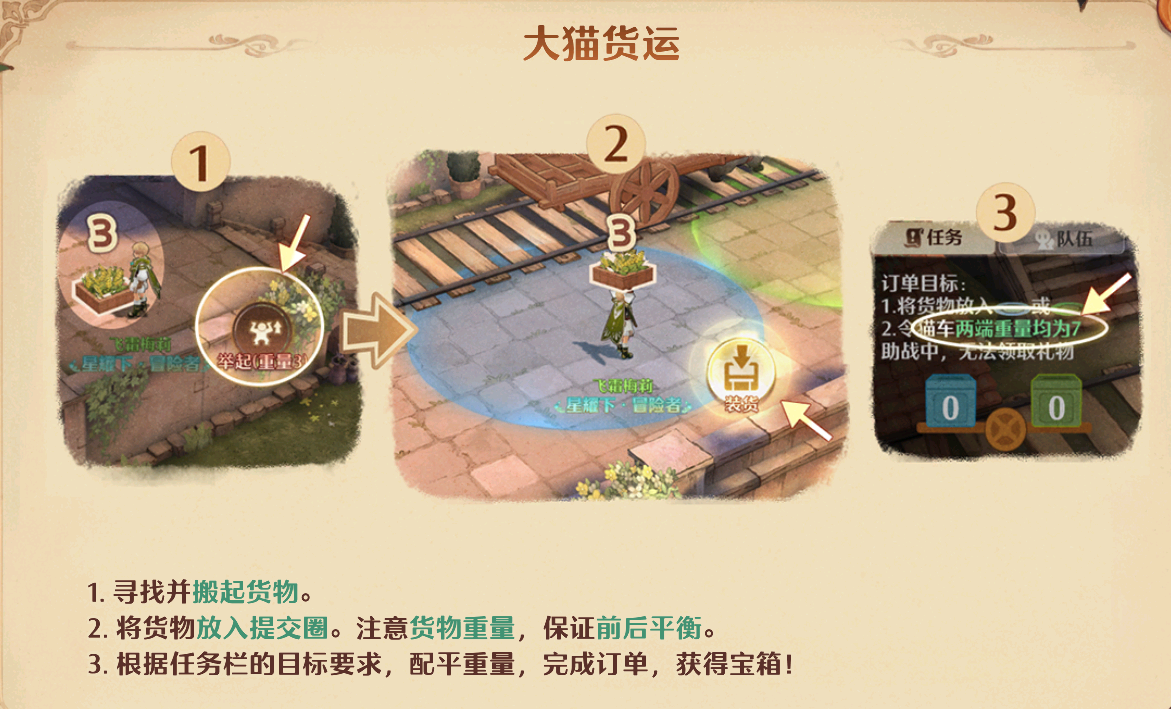 护卫的过程相信身经百战的各位应该都不会有疑问,只要练度不是太低,打这个捣蛋团一般都不会有大问题,主要就是搬货的过程需要掌握一些技巧,你需要先按顺序找到如图所示的这些货物,接着来到它们旁边点击“搬起”,之后再来到货车前对应的圆圈内放下才行,这个过程反复几次就可以随着货车启程,之后再把沿途的敌人消灭即可!