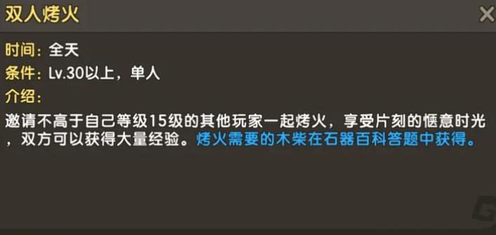 在这个还原远古时代的游戏里,有一个很特别的玩法,那就是两个人一起烤火。而这个游戏模式,则是在30级以后,才会出现的。而要参加“双人篝火”,首先要做的就是做几个任务,把自己的等级给升上去。这些任务包括采集资源,完成探索,在不断的努力下,不仅能够升级,还能够获得更多的玩法。