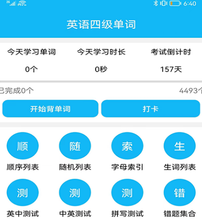 此软件主要是帮助顺利度过英语四级的,如果真正考过英语的人就会发现四级,虽然说难度并不是特别的大,但依旧有很多的内容需要掌握。利用软件就可做题、搜题,还能帮助更快的通过考级的内容。打开软件以后,就可点击开始背单词,能将里边所包含的单词全部背会,肯定有利于考试。也会显示考试倒计时以及今日学习时长的详细内容。