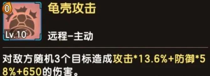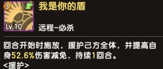 其杀手锏“我是你的盾牌”可以在第一轮就用出来,对所有被保护的人进行保护,并且有一定几率替被保护的人挡住近身肉搏的伤害,并且对自己造成的伤害有一定的减免作用。另外,卡拉格尔的“龟壳攻击”可以同时对三个敌人造成不同程度的伤害,并根据攻防情况进行相应的调整。