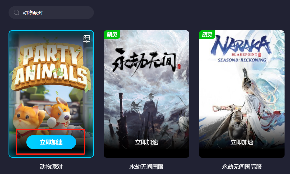使用biubiu的加速功能前,你需要现在上面完成注册和实名,之后还需要针对自己想要加速的游戏进行搜索和添加,“动物派对”也是如此,直接在搜索框输入它的名字,之后将其添加到自己的专区,然后点击“立即加速”即可,这个加速的效果立竿见影,进游戏后能明显感觉到流畅度的提升。