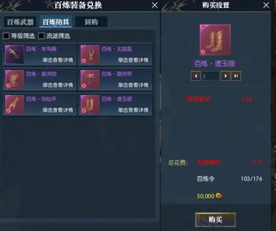 最后就是通过挖宝和修行了,玩家在挖宝中可以挖出凌神峰副本,这需要三个人组队才能打开宝箱,里面就会有很多装备。然后玩家通过仗剑修行运用武林风云录就可以炼出百炼令,玩家可以通话它来打造百炼紫装这件装备,是非常实用的一个途径。游戏内有商店,如果是氪金玩家觉得麻烦,可以直接在商店内进行装备购买,这是最直接的办法,可以直接获取自己心仪的装备。