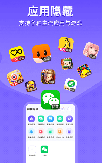 如果在生活中我们的手机上有一些软件,不想被他人发现,那么就可下载应用隐藏这款软件,它的操作非常简单,无论是您的微信、还是微博以及经常玩的游戏,都可通过该软件隐藏完毕。能够设置社交应用密码锁,在使用的时候,只需要输入正确的密码就能够进行操作,非常的安全。还可建立私密安全空间,将在生活中一些重要的视频、音频保存起来。