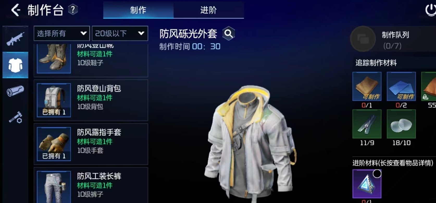 防风外套采用特殊的防火防水材料制作,不仅提高了舒适度,而且经久耐磨,自带荧光效果在户外能见度极高。玩家进行制作时,需要用到试管镜片四个镜皮,两个塑料,九个拉链和一个粗布条,能够为玩家提供14点防御,27点护盾和12点生命值三方面加成。装备制作所需要的材料在度假河谷即可进行收集,例如拉链和螺丝钉都是可以通过拆解零件来获取的,像其他的轻皮材料则可以通过狩猎来获得。