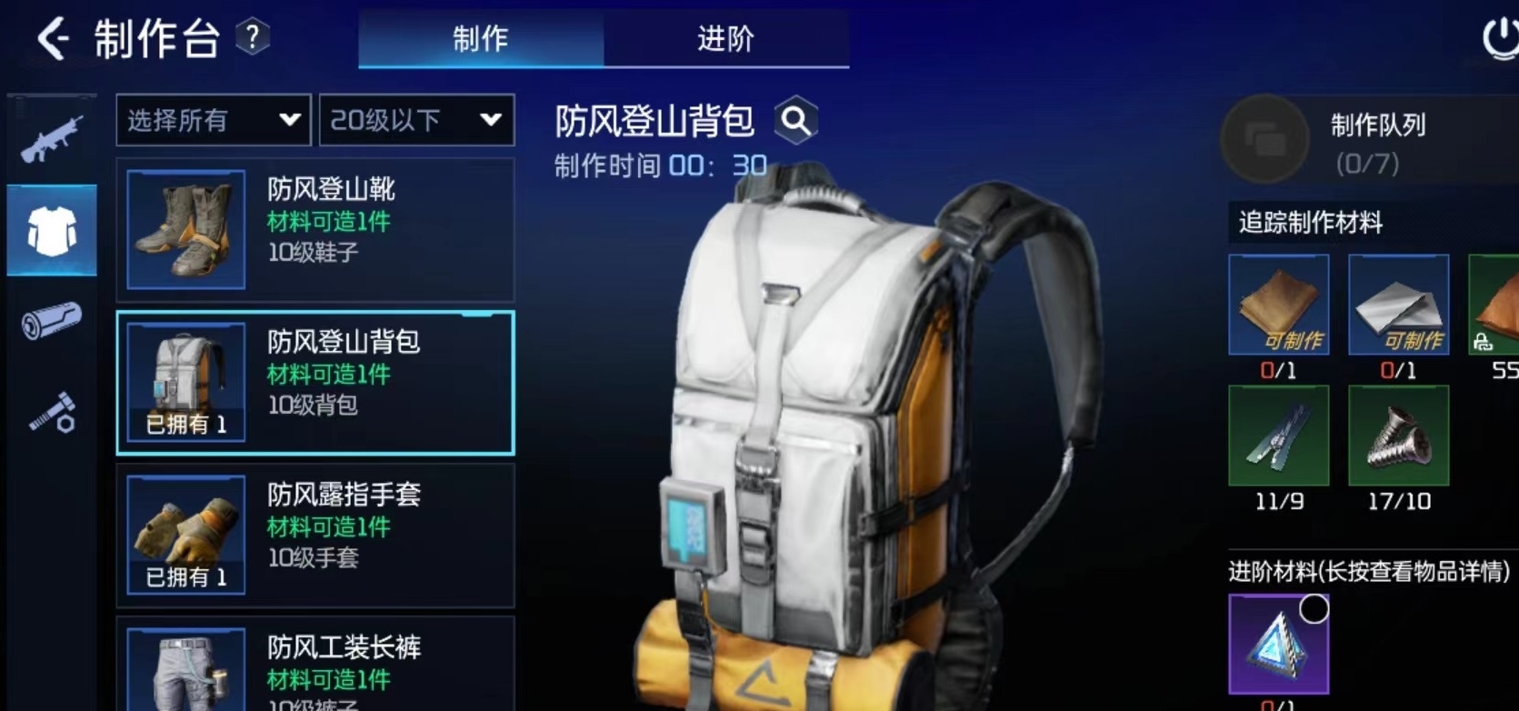 防风登山靴,是一款专门为复杂的山地而设计的一款靴子,方便长途跋涉,不仅外观设计酷炫而且功能齐全,玩家想要制作则需要手机十块镜片,四个金皮,两个塑料,九个拉链和一个粗布条,他可以提高7点暴击率和13点攻击力。放风登山背包可以提高9格背包容量,55点护盾值和32点生命值,
