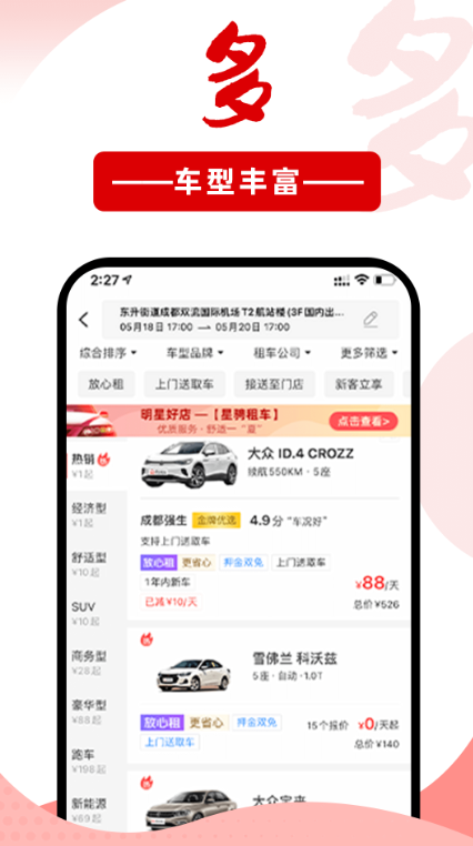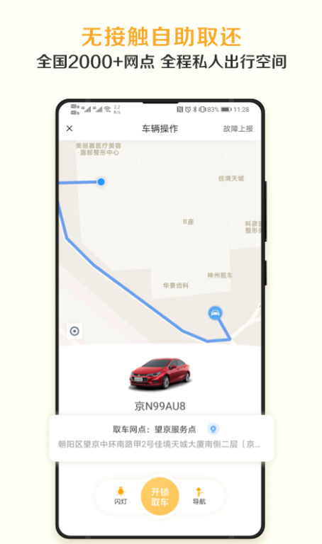 这款软件支持用户自助取车和还车,实现了租车零接触,让用户能够自由地租借车辆而无需等待。软件覆盖了全国2000多个还车网点,车辆上设有租放点查询和导航功能,方便用户在外出旅行时能够快速找到还车点。用户在选择车辆时,可以查看详细的车型、排量信息,并进行个性化筛选,如果有合适的车辆,还可以提前预约。