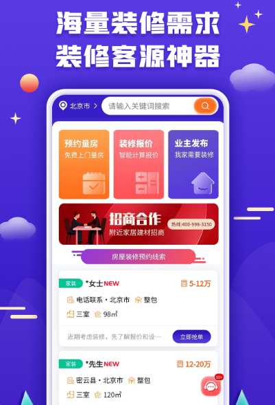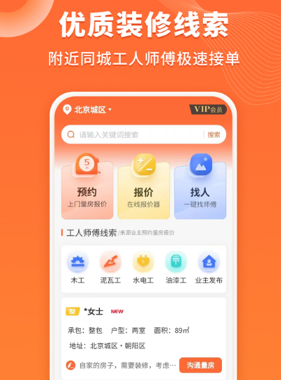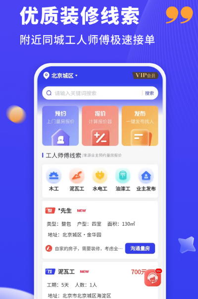 相信有很多从事装修方面的人群,在手机上都下载了这款软件,上面涵盖的信息量比较多,比如在上面找水电工人、安装工、装修工、木工等多种工种的工人,只需要一键就可完成接单,能够以快速的时间,为你找到理想的工作。节省不必要的流程。该软件也有专业的客服团队,在出现任何问题的时候,都可在第一时间帮助解决。