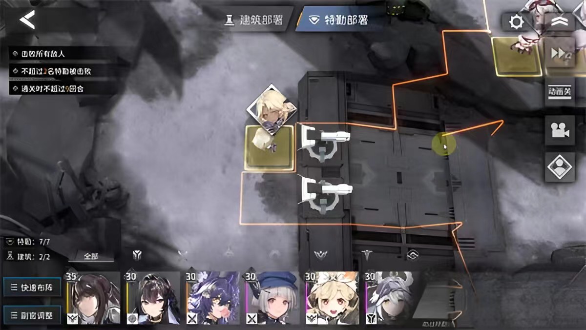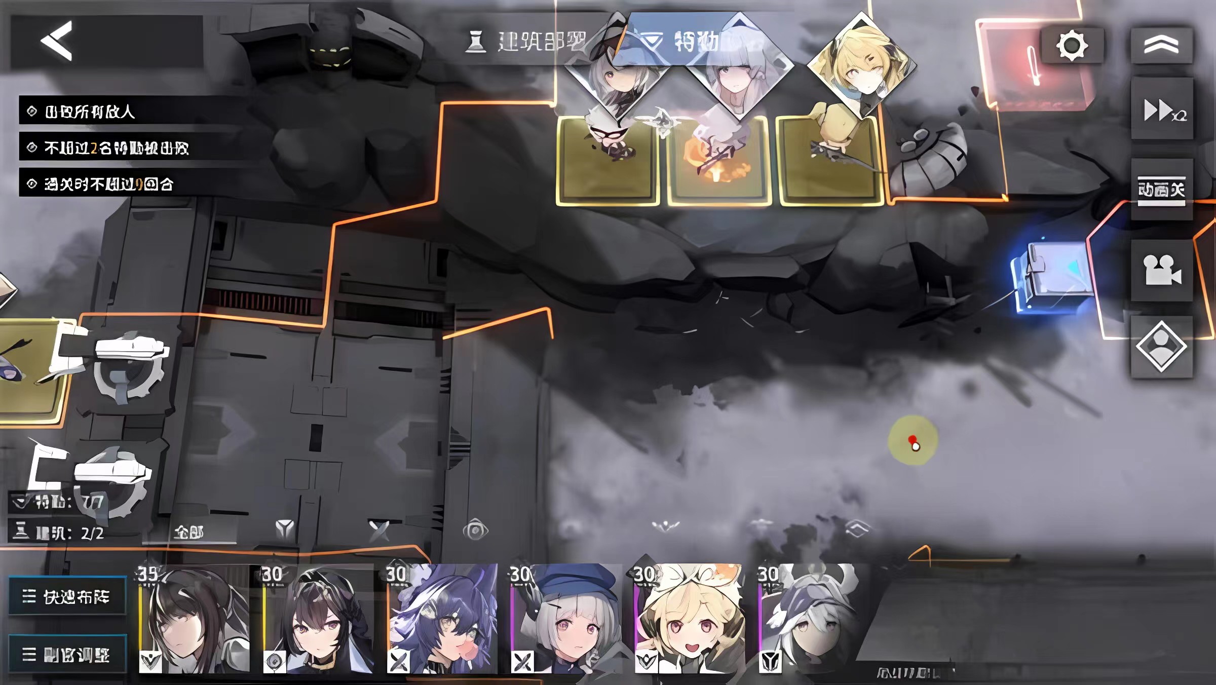 这一关难的地方在于有两个狙击海怪,推荐以拉尼娜 脉冲 影 可露丽 弧月 血叶兰 赫克特为阵容,刚开始玩家可以使用血叶兰,弧月,赫克特全都往拉尼娜那里奔去,脉冲以及可露丽则是去占据最主要的攻击点,随时准备开打,第二个回合,拉尼娜就可以开始全力对敌人开技能了,脉冲在原来的地方去攻打下面的火力小怪。