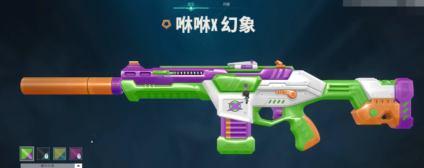 咻咻X:它的配色主要有绿,橙,白,紫四种,整个枪身的金属质感不是很强,不过配合它那略显滑稽的音效,在实战中使用时会有不错的手感反馈,其整体更像是一把玩具枪,所以玩起来的时候会感到很放松。