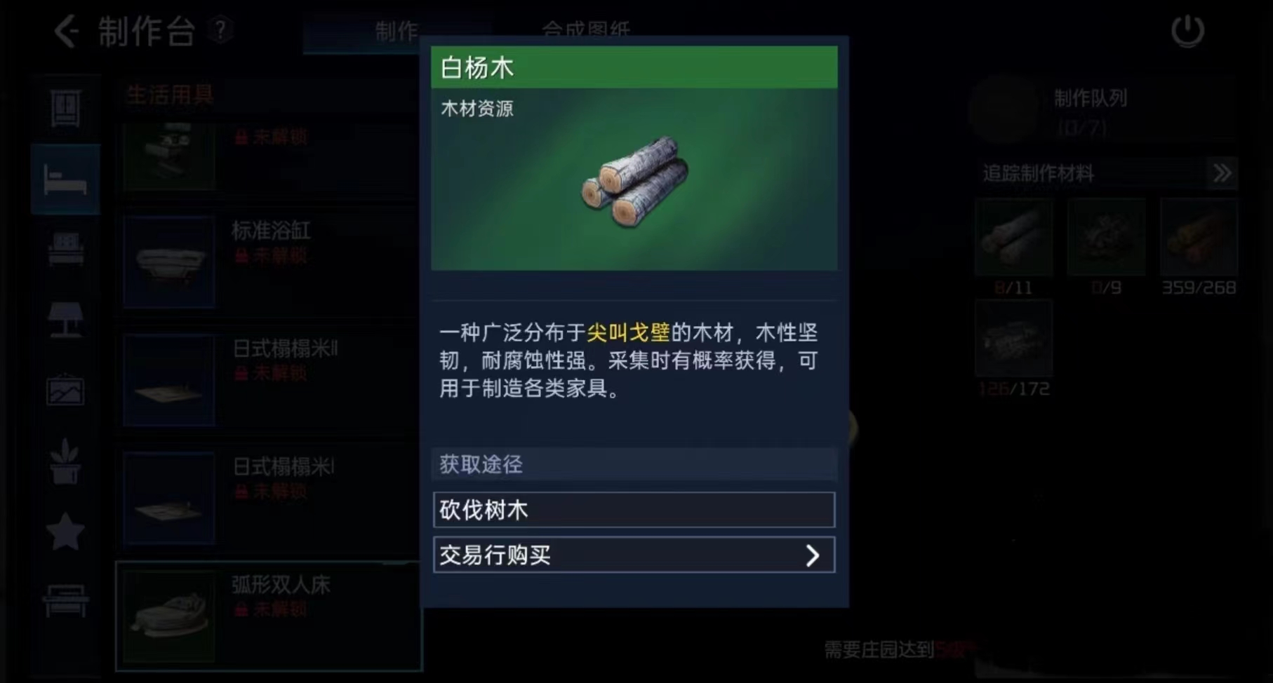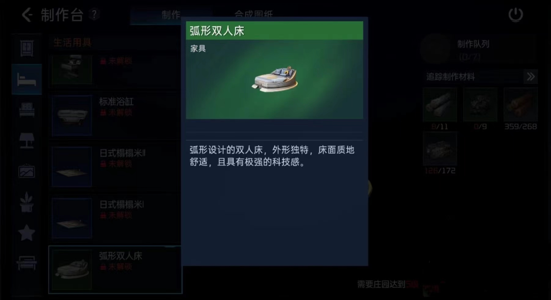 不过虽说所有床的效果都是一样的,但是大家还是会讲究一点外观,弧形双人床从外观上来看就是比较高级的,而且堪称绿色品质哦,当庄园达到了5级的时候,就可以开始打造这个床了,不过打造的时候也是需要材料的,这几种材料都是很常见的,比如说白色木材,石材,白杨木以及软锰矿。