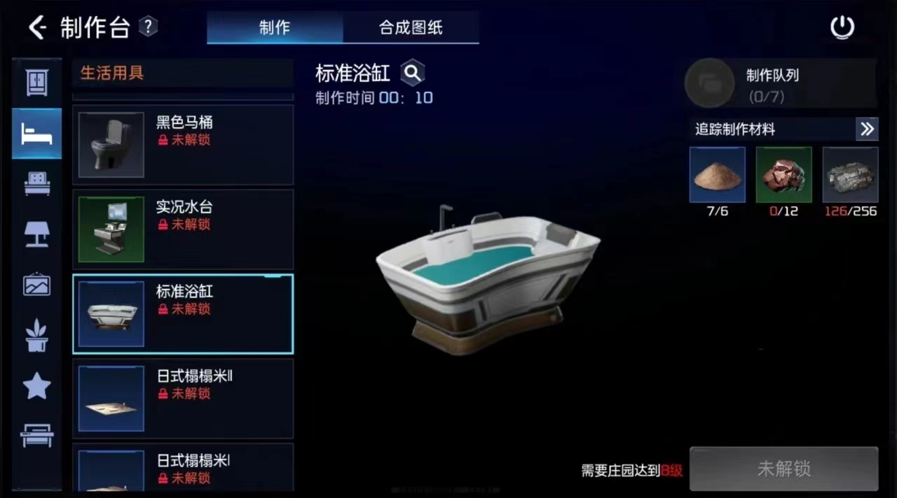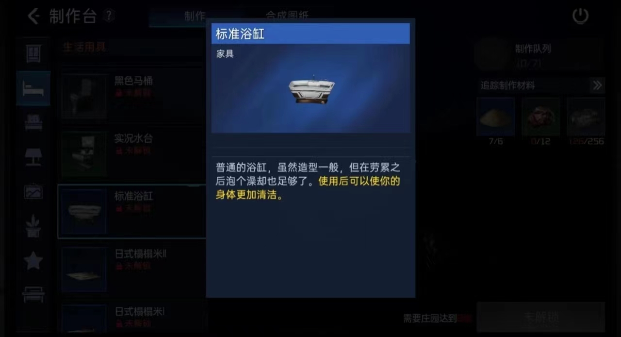 玩家想制作标准浴缸的话,可以直接去家具制作台,在生活工具里就可以找到标准浴缸,标准浴缸是属于蓝色品质的物品,不需要额外再去寻找图纸进行制作,等到庄园等级达到了8级以后就会自动解锁了,虽说浴缸在外形上面看起来一般,但是满足的需求还是蛮大的,尤其是在疲劳的时候使用,它可以让自己变得更加的清洁。