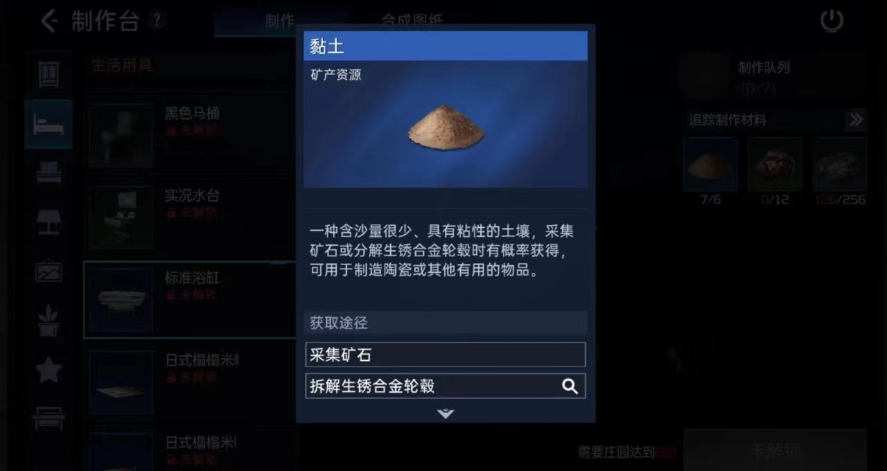 粘土属于蓝色品质的资源,一般玩家在采集矿石的时候都会伴随着粘土,将所有的材料全都收集完了以后呢,玩家就可以开始制作了,只需要10秒的时间就能制作完毕,之后将它放在合理的位置就行了,最好是放在门口,因为这样一进家门就可以去泡澡了。