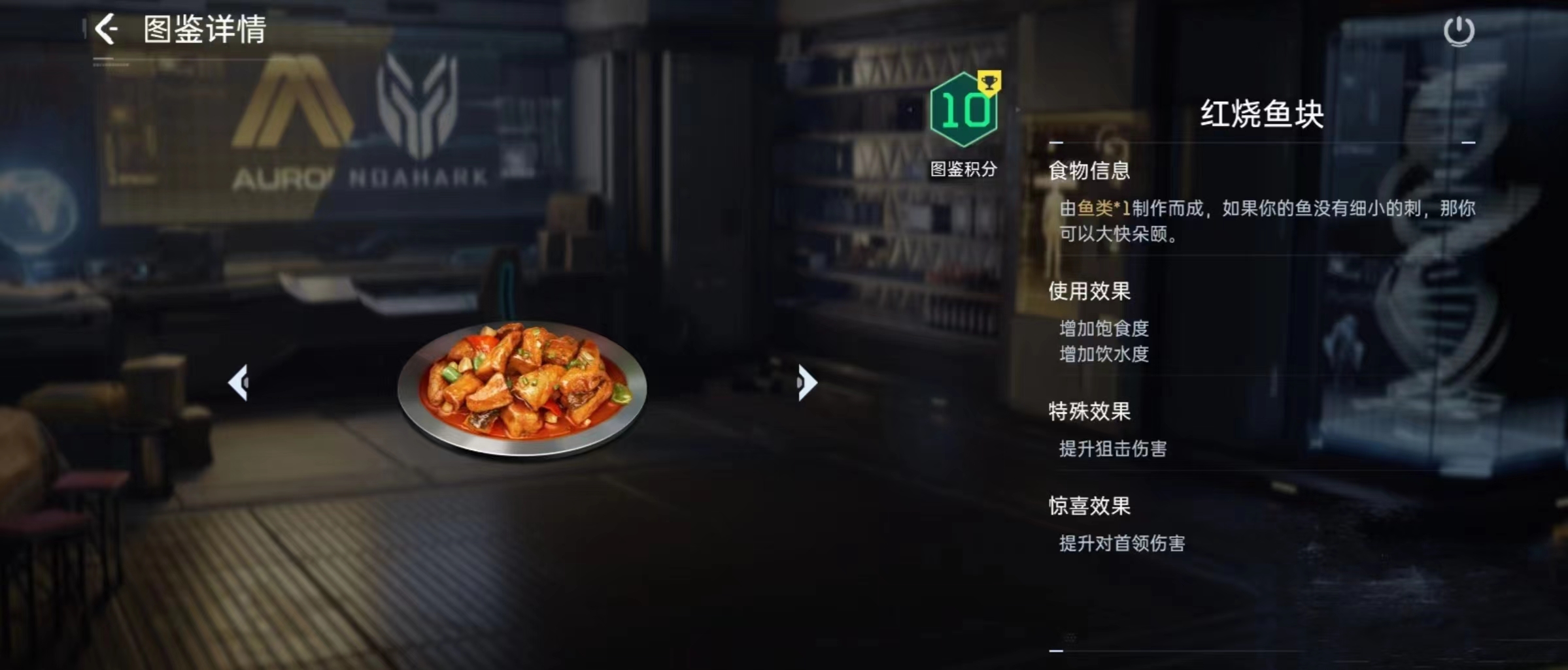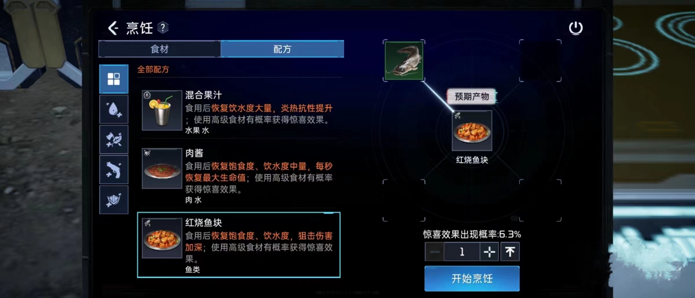 红烧鱼块的制作材料还是比较容易获得的,因为只需要随意取的一种鱼类就行,在所有的烹饪食物里面也算是比较简单的,当玩家使用了红烧鱼块以后,就可以将饮水度和饱腹度给提高,不过要记得一次性最多只能加入四种鱼类进去,不止如此,还会有一些其他的效果出现,比如说可以提升狙击伤害,还能加深对敌人的伤害效果,在实战中都是蛮好用的。