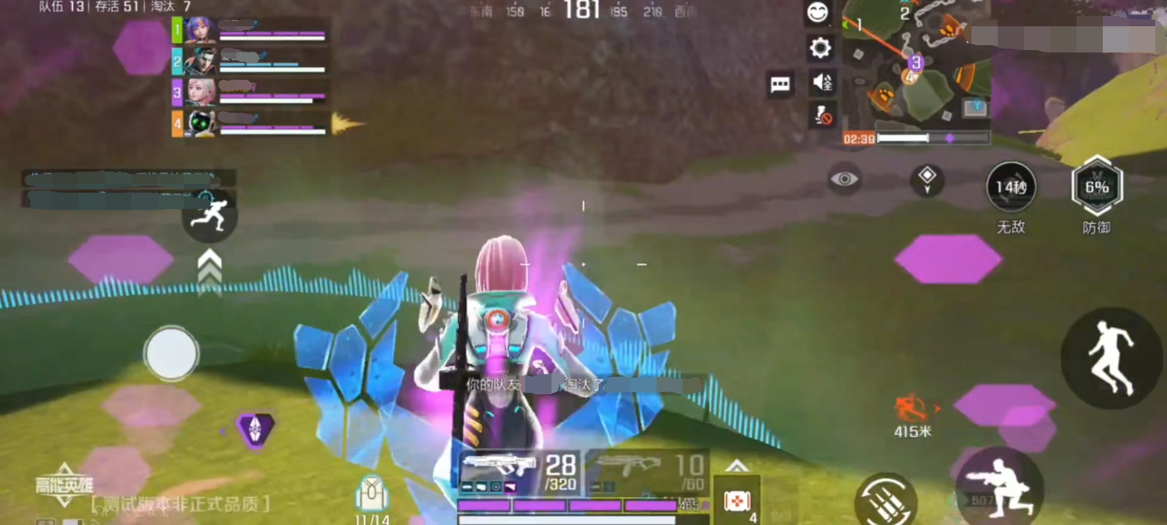 要知道绝招的无敌装备是可以被敌人打坏的,装备也是有血条的,关注血条的使用量,在消失的瞬间找到掩体,经过小编的测试,绝招是可以窗墙的,光圈范围是上下7米左右的圆弧形区域,大招运用好了,菲儿可以在战斗中救死扶伤。有一个小技巧:可以将敌人锤出这个范围圈再将其击杀。