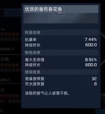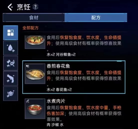 在制作香煎鱼的时候,需要注意鱼的获取方式和鱼的种类,不同等级的春花鱼制作出来的食品等级是不一样的,恢复生命值的大小也是不同的,所以玩家可以在能力的情况下优先选择优质的鱼。