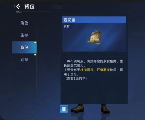 首先第1个材料,春花鱼春花鱼这个材料需要在河水中才可以获得,主要分布,在杜加河谷,开普勒港等地区玩家需要耗时很长时间和钓竿道具,才可以将春花鱼钓到,制作优质的春花鱼需要使用到两只春花鱼,如果玩家只抓到了一只春花鱼,那么相间春花鱼获得的生命值可能会降低。