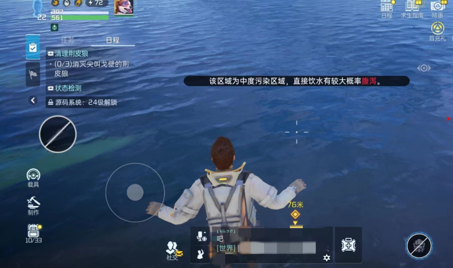 当然想要补水,并不意味着所有的水源都能直接饮用,·被污染后的水如果喝下去,会使情况恶化,严重时可波及生命。玩家可以返回家园利用饮水设备补水,家园中高净化的水源效果极为明显,体力可瞬间恢复至满格。还可以多利用装水容器,存储更多的水,每瓶水可补充三十点饮水度。如果玩家在野外无法返回家园,就只能利用过滤瓶在有水的地方进行补水,经过过滤后水就可以喝了。