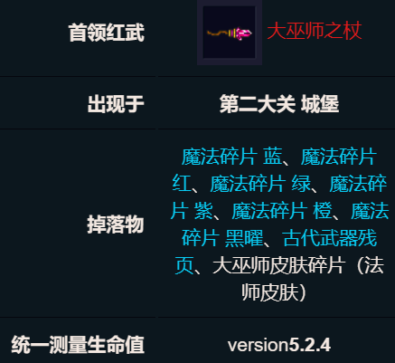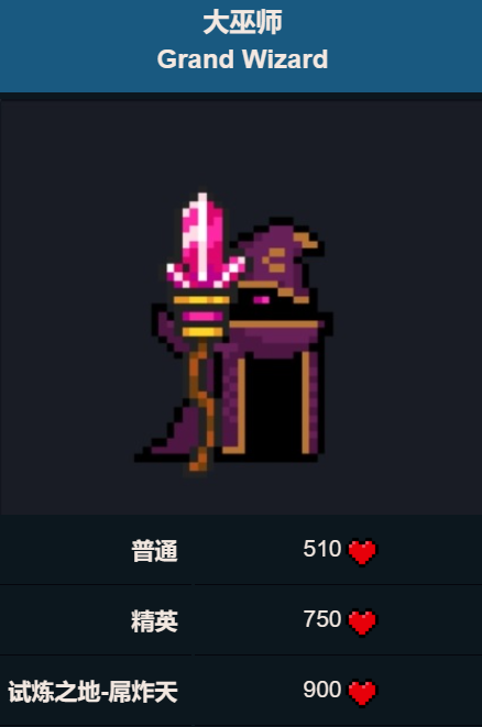 而大巫师是第二大关城堡地图的一个boss。首领特点是大巫师的技能机制非常规律,所以躲避起来并不算难。环境特点:大巫师所在房间靠近中央的左上、右上、左下、右下方均有一处4×2的箱子(外观为装有书卷的罐子),而房间中央有一块蓝色毯子,而毯子的右侧偏下处有一处书桌作为掩体。