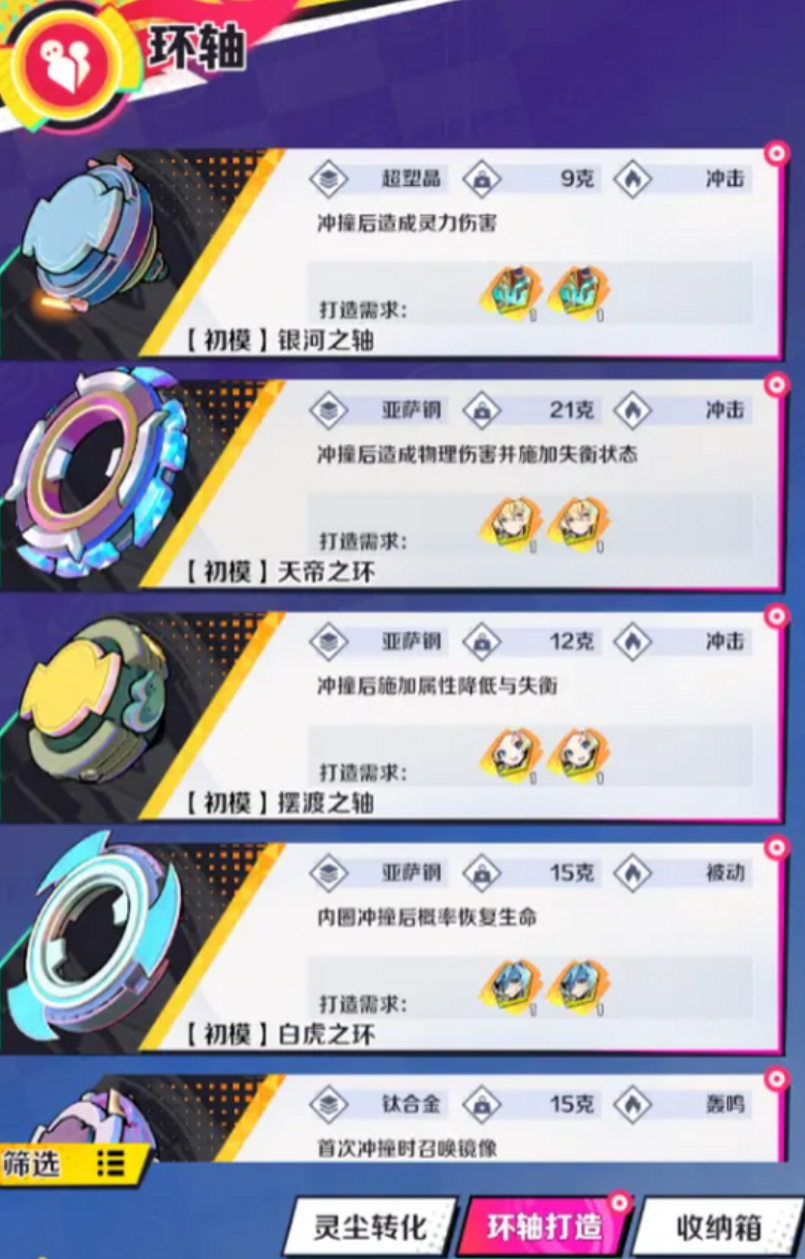接下来是环轴的形成了,环轴包括重力环和驱动轴,在战斗中可以对属性技能完成奖励,它们的种类根据材料有三种,技能不同的有四种。如果想要加工建造环轴,就需要用到雕刻并且只有一次建造机会,它不会像誓言一样会出现重复的环轴。雕刻质量也很重要,这关系到环轴的力量,需要用低一星的雕刻去雕刻环轴,并且还需要使用灵尘对他进行打磨。