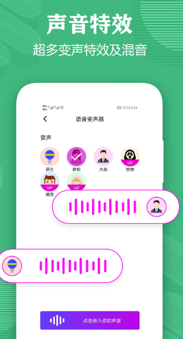既是变音,也能成为助手,百变语音包,超多个性的选择,声音由玩家随意支配,分分钟就能让你出名,轻松驾驭各种声音,男声女声可以智能推荐,选择适合你的专属音效,百变语音包,超多个性选择,和真人的声音一模一样,在游戏中的玩家可以开启悬浮模式,游戏聊天打造变声模式。