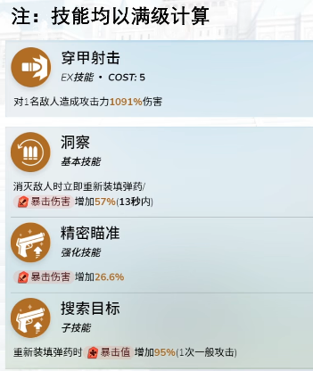 亚子技能提供的爆伤是73.3%,而莲实一个小技能提供的爆伤就足足有57%,相当于大半个亚子,这大大提高了莲实的伤害上限。即便没有亚子BUFF,她也能在持有基本BUFF的情况下一枪暴击出破百万的伤害。强化技能不必多说。子技能里需要提醒的是,一次一般攻击后增加的是暴击值而不是暴击率。