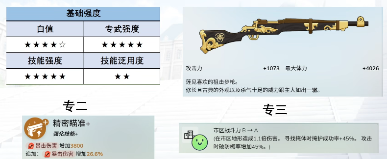 莲实的专武强度非常高,专二强化的暴击伤害进一步拉高了莲实的上限。莲实专武的攻击力在所有学生里排名第三。莲实作为二星角色,专三给到的是市区战斗力B-A,这对于莲实来说,还是非常受限制的。