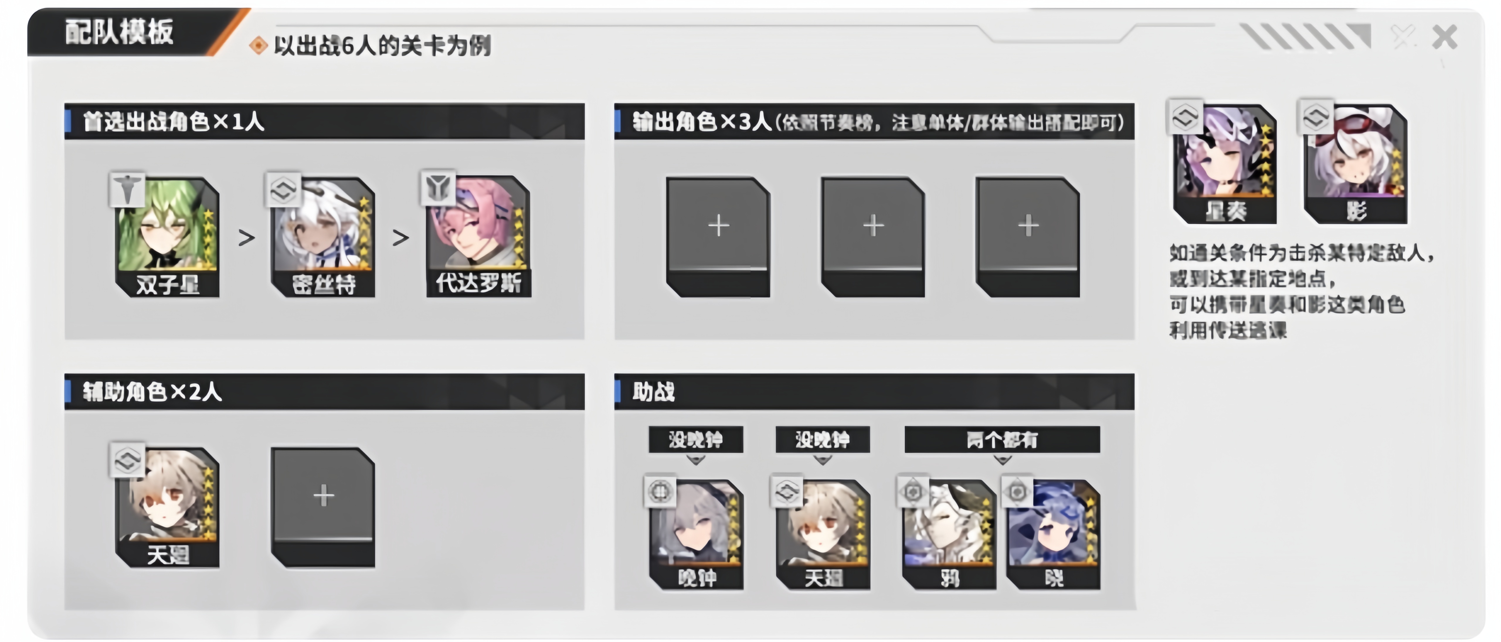 最后一个位置的选择上就要根据玩家们自己对于副本或者关卡的了解来自由选择了,如果敌方输出比较大那也可以带一个医疗角色帮助队伍进行一个抗战延续,如果敌方小兵较多,那么选择一个火力职业可以有效清除,都是不错的选择。
