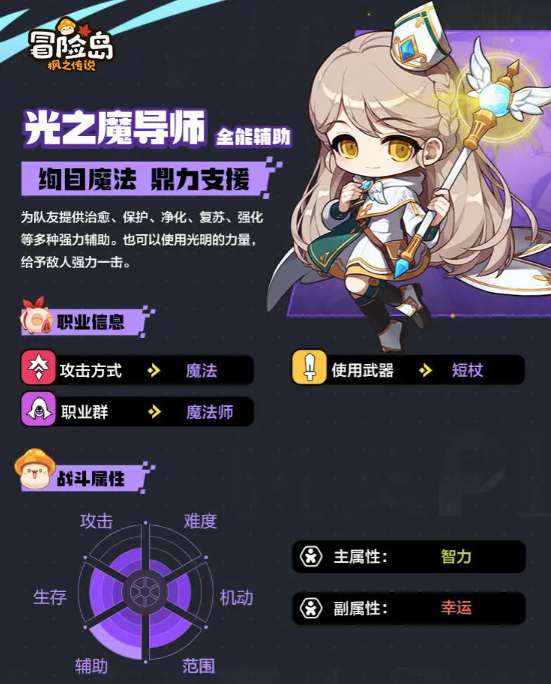 光之魔导师:依然是远程职业,其技能包括了伤害与治疗手段,其中一技能可以发射一个魔法球,命中敌人后爆炸并造成AOE伤害。二技能则是一个单纯的位移,本身并没有其他特殊效果。