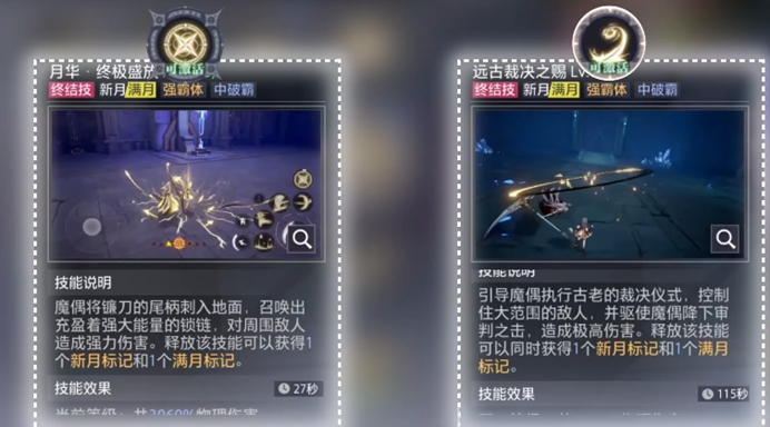 双必杀技能终极盛放和远古裁决还是非常强势的。被动技能,义肢改造,这个技能可以提升镰卫的自身生存能力。交相辉映能够增强胧月秘术的BUFF,大幅提升镰卫的辅助能力。