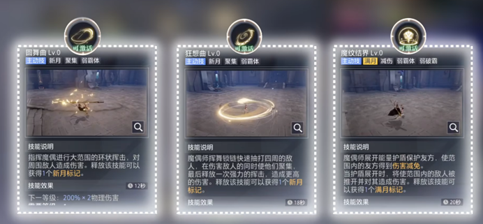 旋刃激跃技能伤害较高,且拥有远距离位移效果,不仅能提高自身输出能力,还能在高难本以及面对BOSS时更加从容的躲避BOSS机制,并且能够提供新月印记。灵魂链接技能可以同时连接范围内所有队友,降低队友承受到的伤害,如果配合上被动技能灵魂摆渡,还能让连接的队友受到治疗的效果,并且能够直接提供一个新月印记与一个满月印记,这个技能辅助能力强。