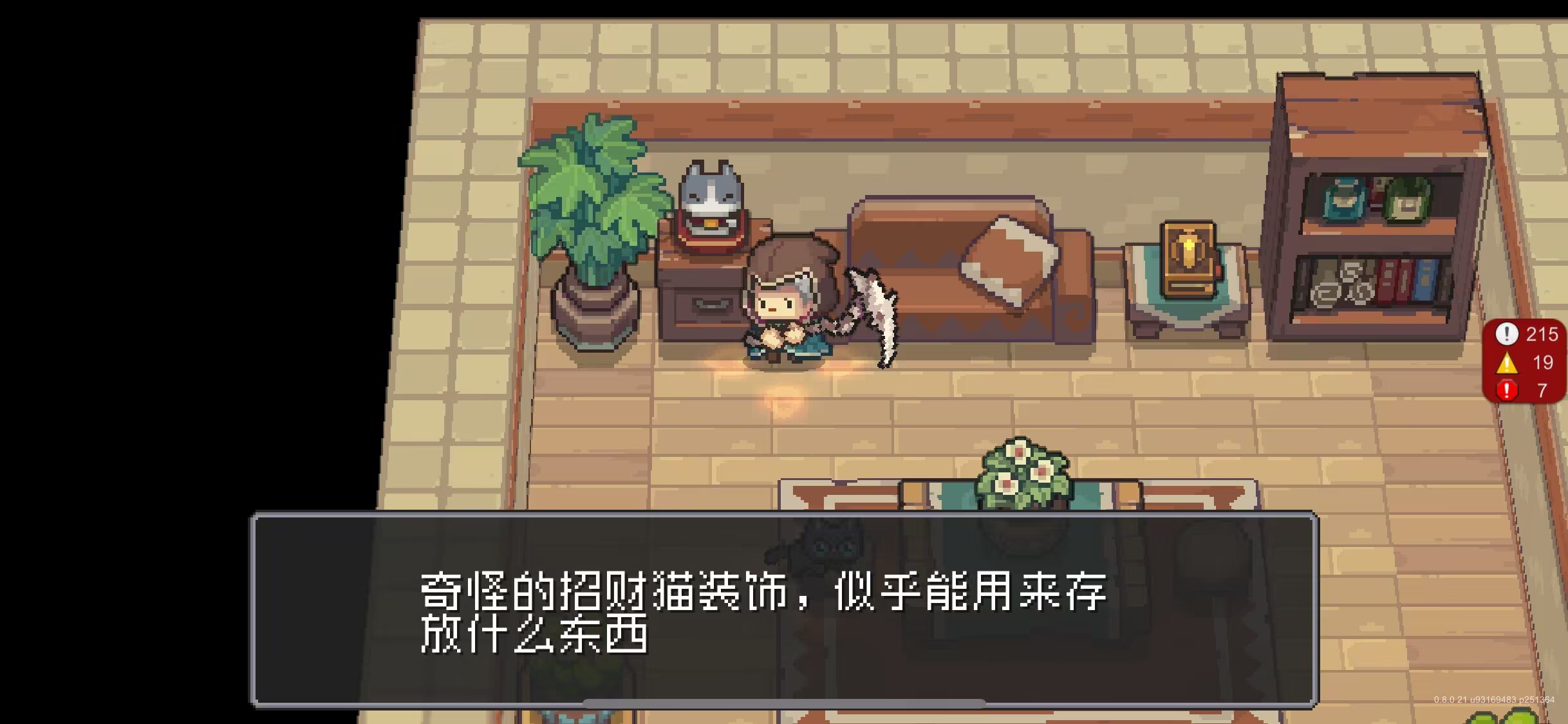 它的具体位置是在房间的左上角,需要玩家走到它前面之后才可以触发后续的功能,初期的时候,点击招财猫只能够收到一句似是而非的提示,提示的内容是说它似乎能够存放什么东西,结合上一代的内容其实不难猜测它的作用与氪金有关。
