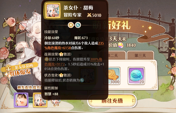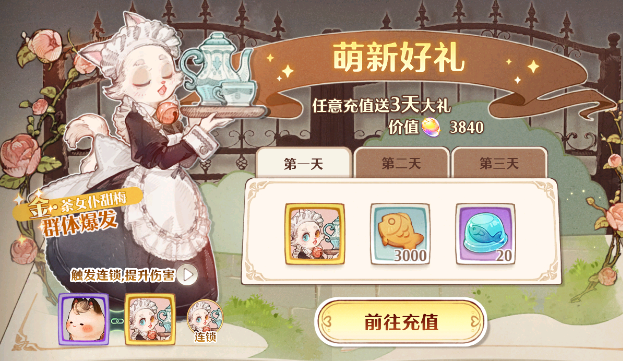 玩家们购买后会立即赠送给玩家们一个【茶女仆·甜梅】与游戏中赠送的猫灵【喵驼·爱派】可以形成连锁反应,会提升角色的基础属性,而且在战斗中还可以释放猫灵技能,会让玩家们们的实力得到显著的提升,还会赠送给玩家们3000个好好吃的鱼干,用于对猫灵强化,还会赠送给玩家们闪闪亮的鱼冻,猫灵在强化后是需要突破的,这个道具刚好有很大的作用。