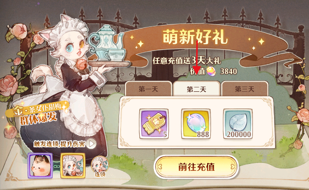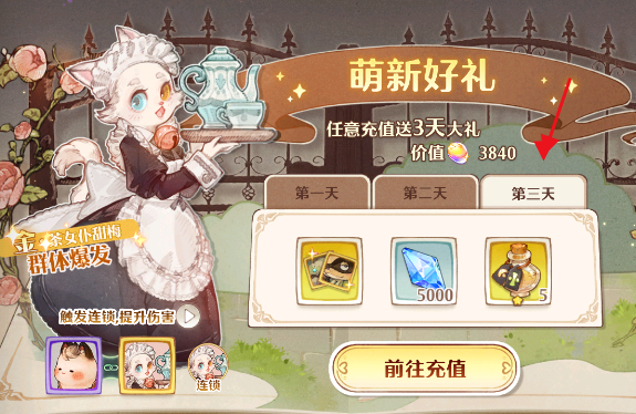 玩家们点击右上角的活动,选择【特惠】就可以直接找到【萌新礼】了,玩家们在这个界面中点击【前往充值】就可以连续获得三天的萌新好礼,而且充值金额是没有要求的,即使玩家们充值六元人民币也是可以的哦!