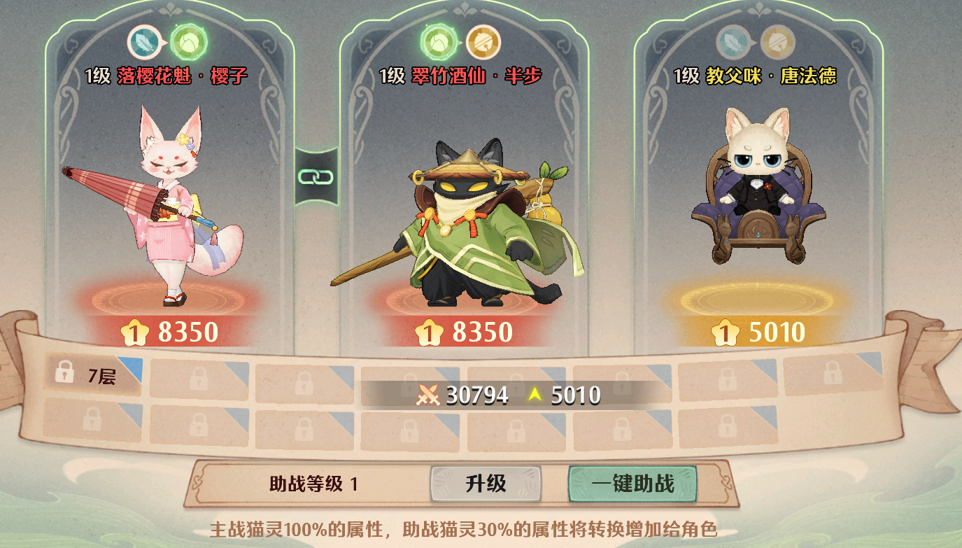除了职业以外,猫灵的搭配对于爬塔也有重要影响,目前最多可以携带三个猫灵,每个猫灵都能够给你提供一定属性加成,同时主战猫灵还能贡献自己的技能为你所用,这里最推荐的猫灵搭配是“落英花魁 翠竹酒仙 教父咪”,这三个算是游戏内属性数一数二的猫灵。