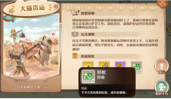 其实在任务里面,有几个是每天一定要参与的,比如大猫货运、装备练习以及魔神训练,还有兽骨深渊。这几个任务里面既有每日副本,也有需要组队的副本。比如说大猫货运这个部分的话,大家在上面主要就是能够拿到经验的,这个任务在所有副本那边来说,难度是最低的,能够获取的卡牌效果确是最好的,而装备练习里面大概能够拿到的装备,目前来说是最多的,其次最主要的大家可以在这个部分里面获取光铂奖励,光铂可以帮助大家在商店里面兑换更多道具,所以大家可以把这个任务跟大猫货运放在一起,做成一个一条龙的任务。