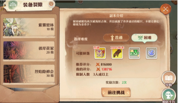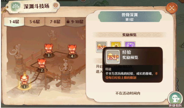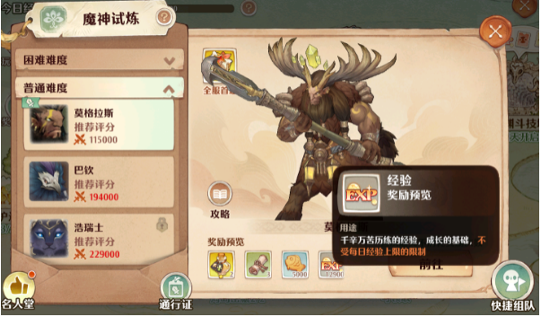 其次魔神试炼这个任务的难度是比较高的,所以大家在上面可能战力不够的话是挑战不成功的,建议大家是放在最后去挑战,因为这个活动他给的红色经验是游戏中比较难得的,所以建议大家有机会还是一定要获取。至于兽骨深渊,这就是其中一个常规副本,建议大家组队来参与,组队参与不仅获取的经验是最多的,还容易过关,不过没有人组队大家也是可以单人参与的,单人来参与的时候,大家获得的奖励也还好,特别是首次过关,但是想要更多奖励还是要组队来挑战。