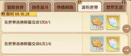 罐子里面的奖励跟大家游历世界里面后台的积分是不冲突的,这两者都是可以同时获取的,另外一个玩法就是跟nbc进行交谈,以及升级好感度,目前大家可以在各个地方都看到游戏中的NPC,就算是路过NPC,大家也可以跟他交谈,交谈的过程中,大家就会看到任务里面的一些要求次数,第一次大家成功交谈之后,就可以去获取一定的成就,任务奖励就是小鱼干以及鱼冻等等,成就任务后期要求的交谈次数会越来越多,所以大家就要去找地图上大家没有交谈过的角色,这些角色才是有效增加的交谈次数。