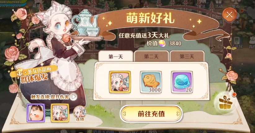 想要氪金的话,那么在这里大家建议是首充一定要拿到,毕竟首冲上面的奖励还是比较多的,购买首充福利里面大家可以看到萌新好礼,这个萌新福利是大家任意充值的,金额不限不管大家充值多少金额都会获取萌新奖励,就算是首充的这个价格也可以拿到这个奖励,会持续赠送三天,而且这三天时间里面大家会拿到其中一个金色的猫灵,叫做甜梅,甜梅作为金色猫灵在群攻效果上是相当不错的,同时还会赠送鱼干道具以及鱼冻道具,这两个道具后期都是为猫灵培养的时候带来强大作用的。