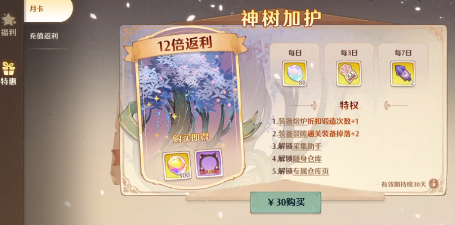 其次推荐大家购买的还有月卡,月卡在游戏中其实是一个很多玩家都会购买的道具,在这里大家兑换了月卡以后就可以获取一定的物资,带来的返利也是十二倍的效果,每天都可以获取其中的特权礼包,还有猫灵兑换劵三天领一次,因为猫灵兑换券在游戏中确实是非常昂贵的一个道具,所以大家一定要记得三天连续签到可以拿到,目前新的外观也是可以通过这个月卡来获取的如果后期想要获取更多特权,比如说随身仓库以及采集速度加成的话,那么月卡是大家必须要购买的。