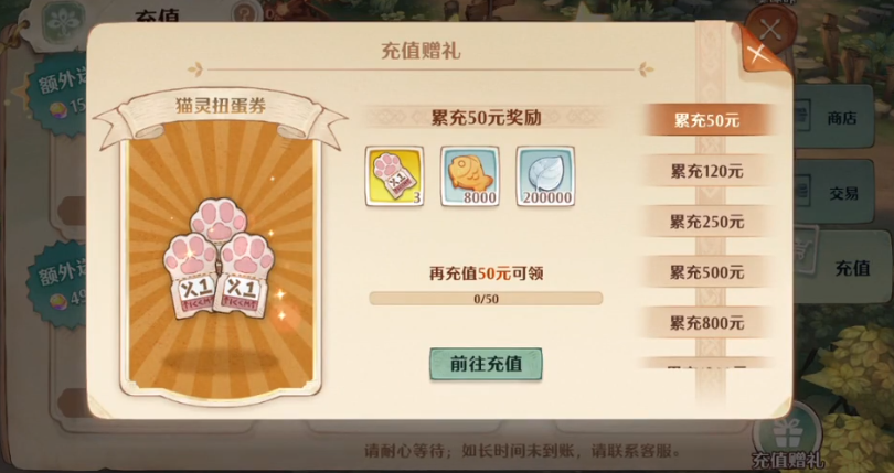 因为后期大家需要通过很多方式来收集资源,而从月卡是上面带来的效果就可以帮助大家节省时间,而且在上面如果大家累计充值到1000以内的话额外送300%的返利,如果是充值到5001以上的话就直接送绝版的称号哦,除此之外,大家如果还要氪金的话,那么建议大家就在抽卡里面兑换更多抽奖券,还有银叶也可以用来招募,因为这款游戏中,不管是万灵还是猫灵,都是可以通过招募来获取的,而大家进行战斗的时候,也是主要利用各种队伍搭配一起进行战斗,所以在这个方面大家不要省哦,而且充值银叶一样是会送猫灵扭蛋劵的。