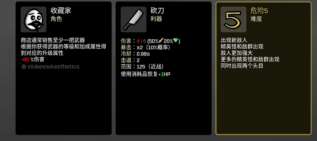 武器:收藏家的负面特性是削弱60%伤害,正面的话则分别是商店必出武器,以及会根据武器的等级和加成来获得对应的额外属性,这个主要得根据你武器括号里的加成类型来判断,简而言之就是武器能吃到的加成越多,那么收藏家获得的对应属性也会越多。