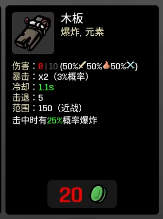 第二个推荐的武器是“木板”,可以看到该武器的伤害可以同时吃到三种加成,利用这丰富的加成收藏家能够获取三种不同的属性,而且这些都是输出向的,能够让收藏家的伤害显著提升。并且该武器还有一个击中后爆炸的特殊效果,触发概率更是高达25%,利用好这点可以实现快速的清理小怪。