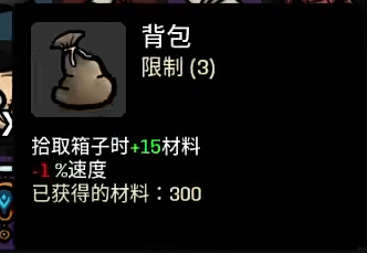 道具:因为收藏家的商店必定出现武器,所以往往需要花费大量材料去刷新和购买心仪的它们,因此它对于材料的需求非常庞大,所以在道具这块,可以优先去拿能提升材料收益的东西,其中最推荐的是“背包”,通过背包的效果,你在拾取箱子时会额外获得15个材料,而唯一的代价只是小小的1%速度损失。